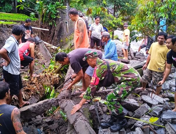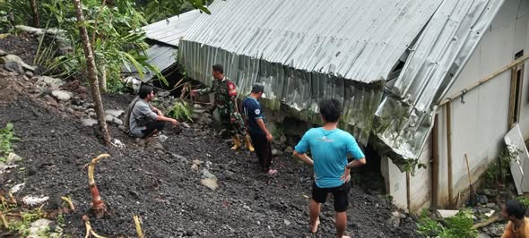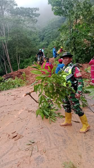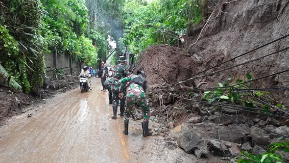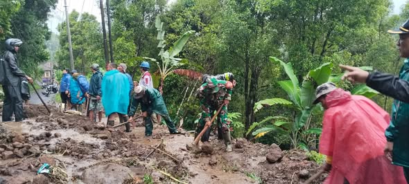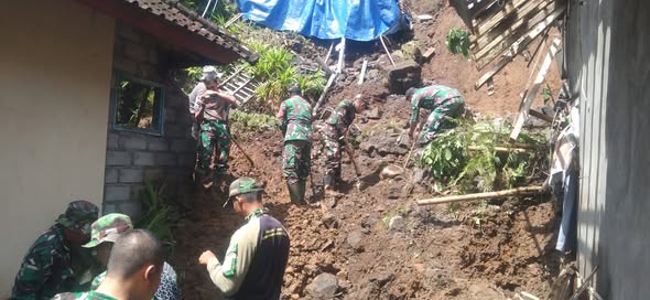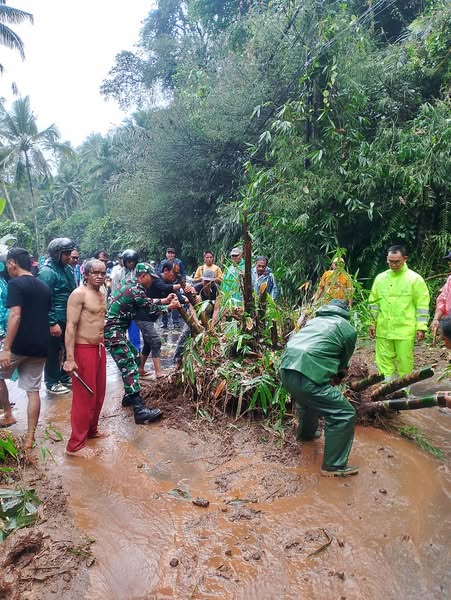 Personel Koramil 06 Marga Bahu Membahu Bersama Warga Bersihkan Material Pasca Tanah Longsor