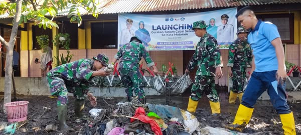 Kodim 1606/Mataram Kerahkan Ratusan Personel Bersihkan Sampah Banjir