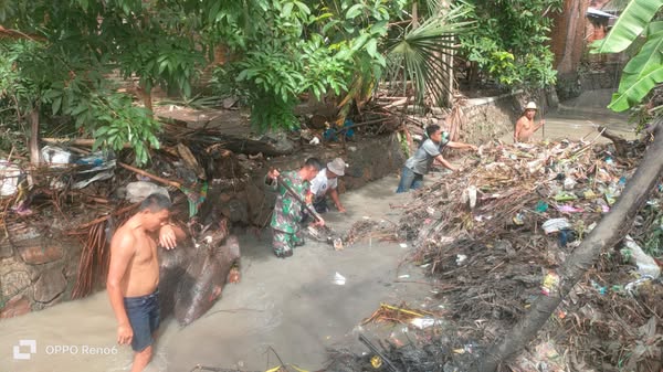 Cegah Banjir, Koramil 05 Kerambitan Bersama Masyarakat Penarukan Bersihkan Aliran Sungai
