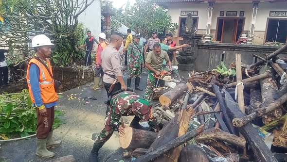Koramil Baturiti Bersama Warga Bersihkan Pohon Tumbang dan Tanah Longsor di Desa Antapan