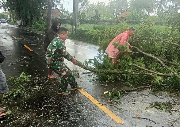 Babinsa Manggis Gerak Cepat Evakuasi Pohon Tumbang Yang Menutup Akses Jalan