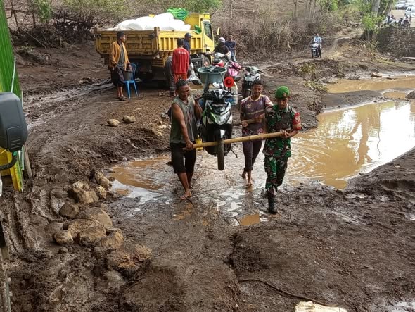 Pantau Jalan Longsor, Babinsa Koramil Halilulik Bantu Seberangi Kendaraan Motor Warga