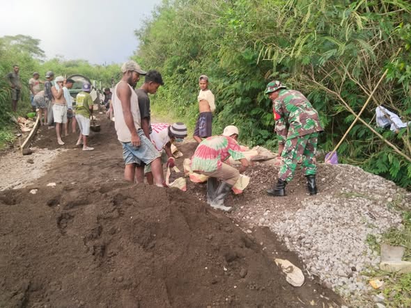 Babinsa Tolo Uwi Bersama Warga Gotong Royong Perbaiki Jalan Ekonomi Desa