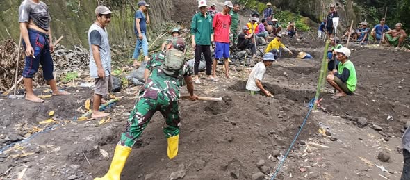 Babinsa Gobleg Bersama Warga Gotong Royong Bersihkan Longsor di Akses Jalan Desa