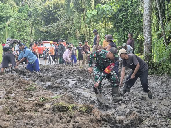 Satgas Yonif 741/GN Pos Nananoe Gerak Cepat Bantu Kesulitan Masyarakat Melintasi Akses Jalan Rusak
