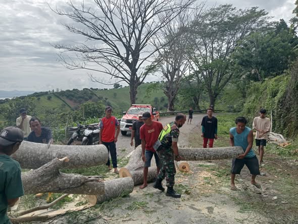 Sigap, Jajaran Babinsa Koramil 1614-03/Hu'u Evakuasi Pohon Tumbang Dijalan Utama Kecamatan Hu'u.