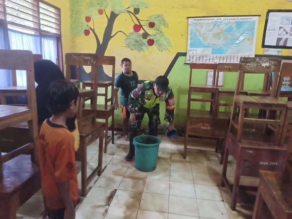 Babinsa Desa Rada Sigap Bersihkan Sekolah SDN Inpres Rada Pasca Banjir