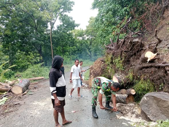 Babinsa Koramil Ende Bantu Warga Bersihkan Jalan Tertutup Pohon di Desa Wolokaro