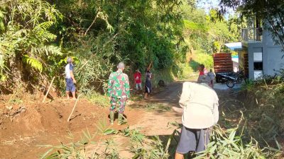 Dengan peralatan seadanya, warga dan Babinsa bahu-membahu membersihkan material tanah dan memperbaiki kondisi jalan. Suasana kebersamaan tampak kental, mencerminkan nilai gotong royong yang masih terjaga kuat di tengah masyarakat.