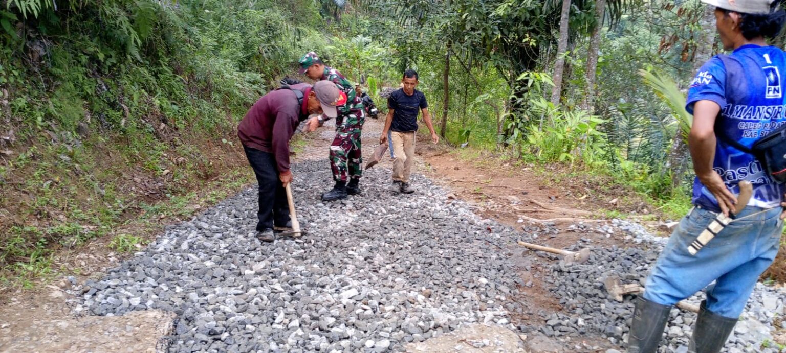 Cisolok, – Wujud nyata kemanunggalan TNI dengan rakyat kembali ditunjukkan oleh Babinsa Desa Cicadas Koramil 2210/Cisolok, Serda Ujang, melalui kegiatan kerja bakti bersama masyarakat dalam perbaikan jalan di Kampung Lebak Nangka, Desa Cicadas, Kecamatan Cisolok, pada Senin, 13 April 2026.