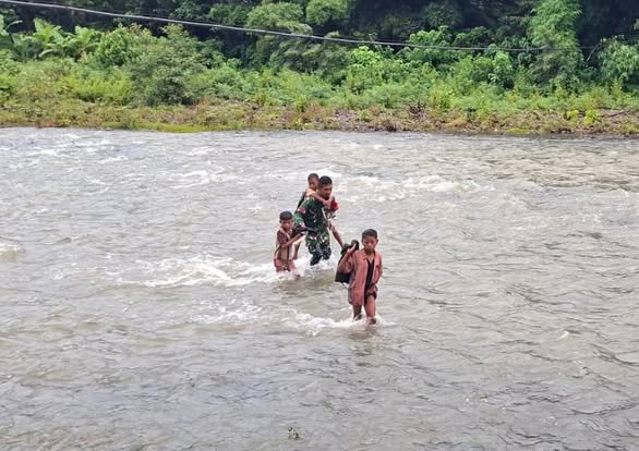 Babinsa Talibura Sigap Bantu Anak Sekolah Menyeberangi Sungai Deras di Watuomok