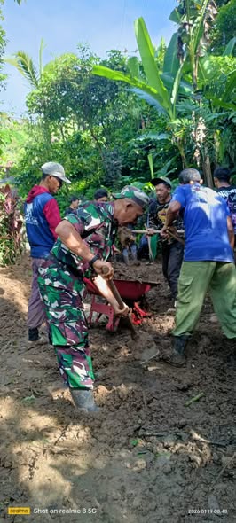 Babinsa Silangjana Bersama Warga Gotong Royong Bersihkan Longsor Tutup Akses Jalan Desa