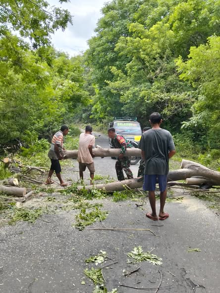 Babinsa Koramil 1624-03/Lewoleba Bersama Warga Evakuasi Pohon Tumbang di Ile Ape Timur